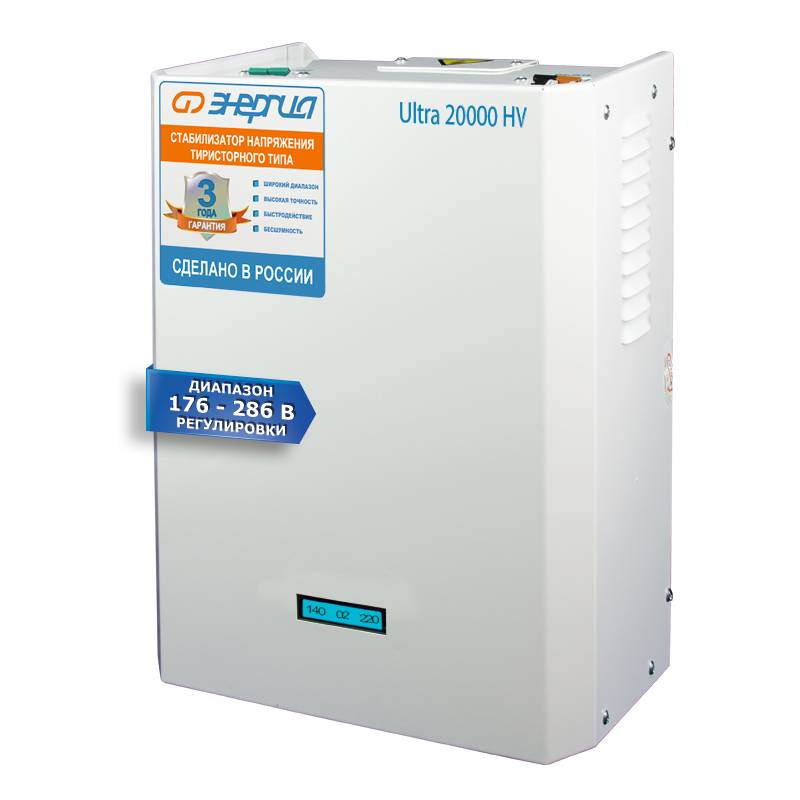 Тиристорный стабилизатор напряжения Энергия Ultra HV предназначен для выравнивания напряжения в диапазоне от 176 до 286 В. Отличительная черта модели - стабилизация повышенных напряжений, рабочий диапазон пропорционально сдвинут в сторону высоких входных напряжений, обеспечивает нормализацию до 220 В.